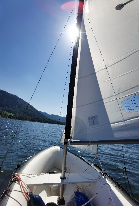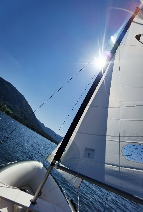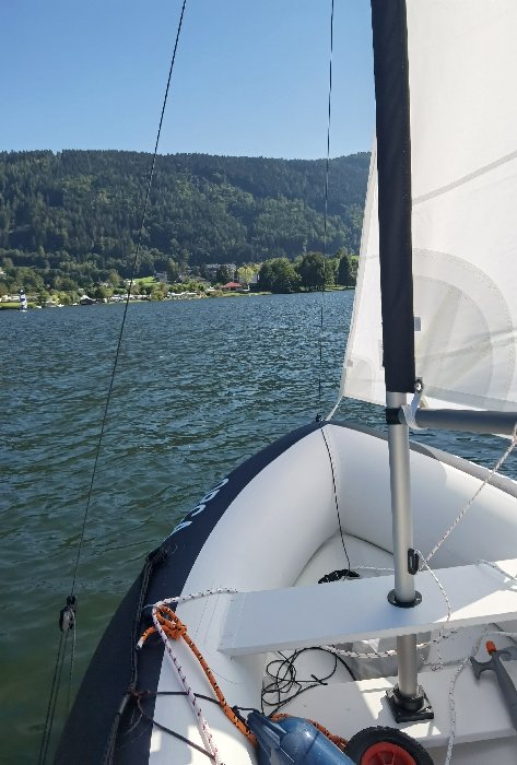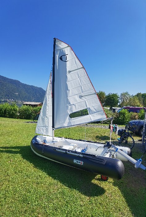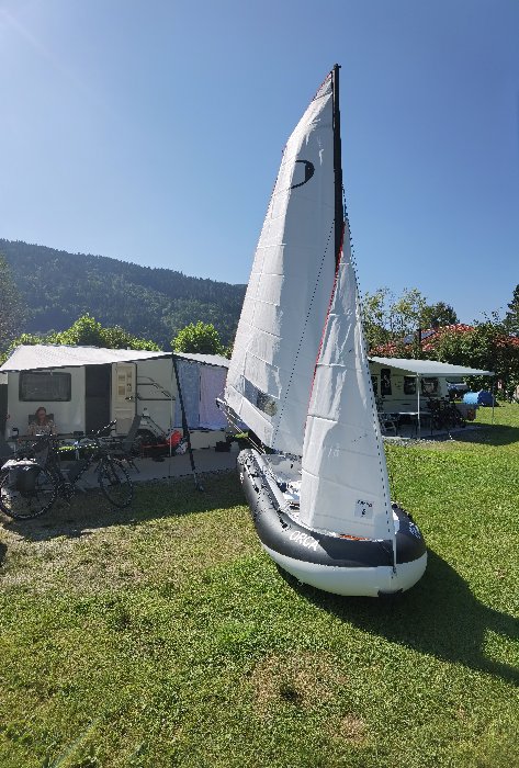 3,75m lang, 1,50m breit, 6m² Segelfläche und 1kW-Elektroaußenboarder